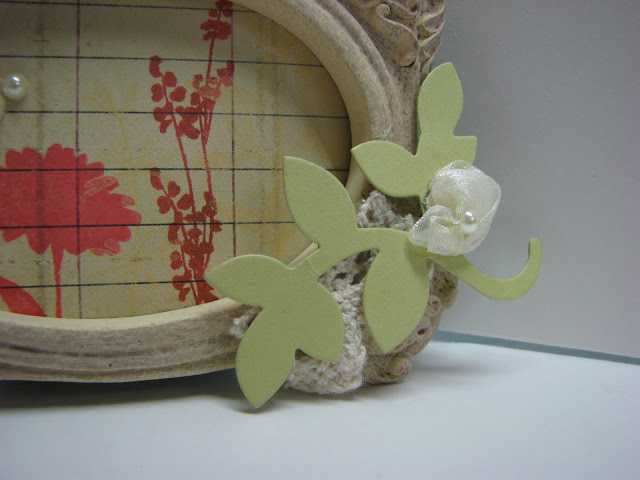 I painted the frame ivory and sprayed it with Coffee Glimmer Mist. Then I took the glass out and stamped on some ledger paper and added a few pearls to it. On the outside of the frame, I added a bit of vintage trim, some leaves and my attempt at a rosette :) I also adhered a bow at the top of the frame for her to hang it.