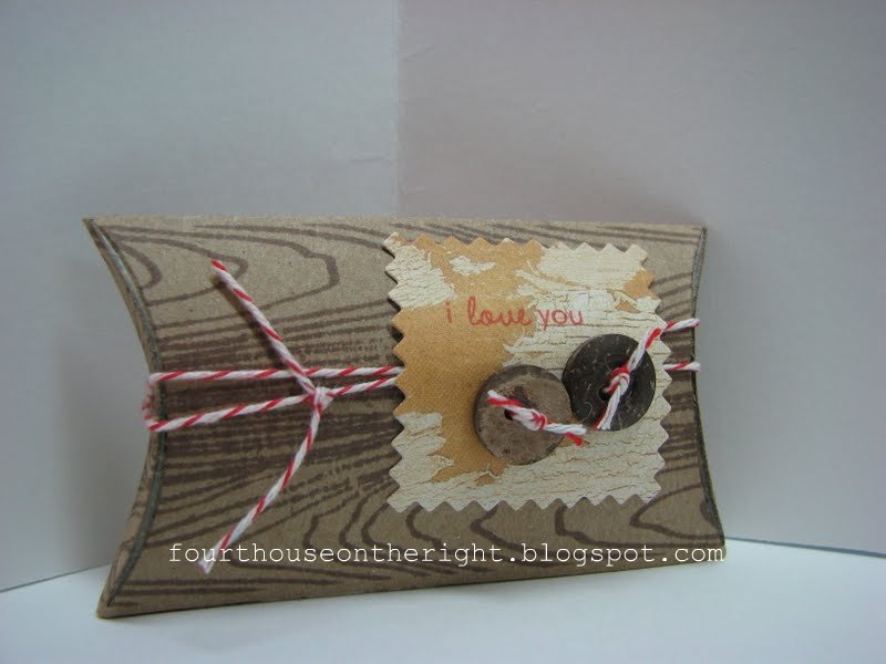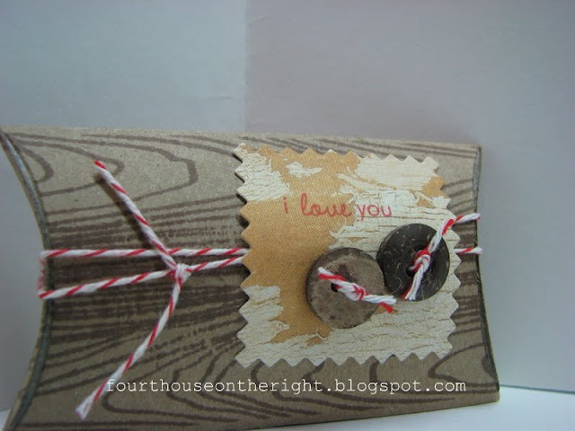 I used my Stampin' Up! pillow box die and cut out kraft colored paper. Then I stamped the wood grain pattern with brown ink, before I folded the box up. All that was left to do was embellish! I just love how this turned out!