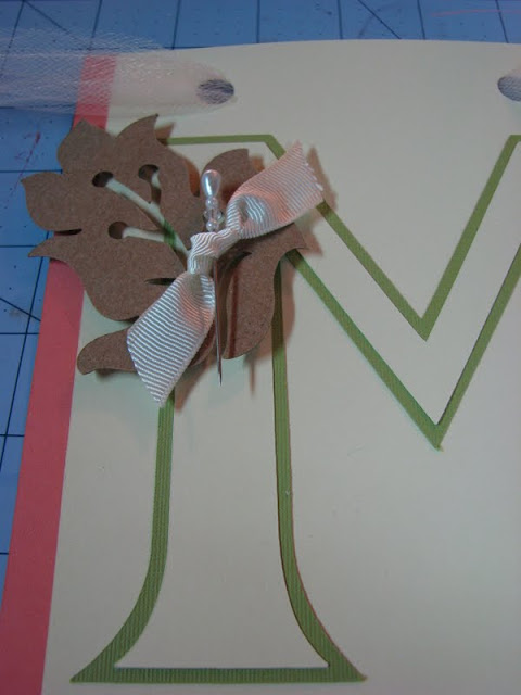Once again I busted out my Birthday Bash cartridge for the banner shapes, ovals this time, and used my Alphalicous cartridge for the letters cut at 5 1/2". I strung the ovals on cream colored tulle and for a little something extra, I added a couple of spritzes of green tulle on each end of the banners.