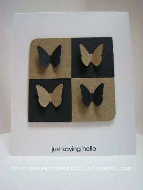 Ooooohhhh, I had so much fun making this card! I punched out four squares, two kraft, two black, and alternated them on my white card base. Then before I adhered them with foam squares, I rounded the corners of the two kraft squares. I went back and punched out four butterflies, two kraft, two black and placed them on the opposite color square. To finish it off, I added a little Hero Arts sentiment!
