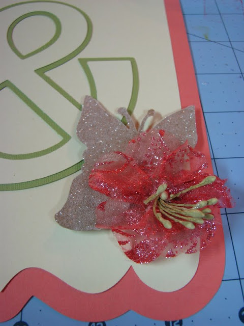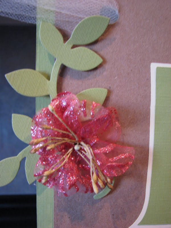 For this banner, Leah wanted a bit more more embellishing. I cut out a bunch of different images from my Storybook cartridge, sprinkled glitter on some, added buttons, ribbon, pins, flowers and brads. I added a little bit to each letter until I was satisfied with the way they looked. This was the fun part for me!