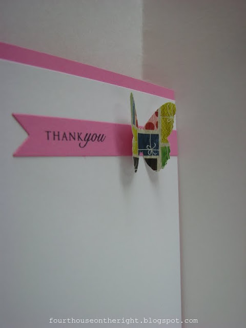 After cutting out all my pieces, like I showed you yesterday, I adhered everything and added my sentiment. This one, from Papertrey Ink fit perfectly in the banner! Then I added the Martha Stewart butterfly, which I had punched out from Basic Grey's Life of the Party, fitting for Birthday Thank Yous don't you think?