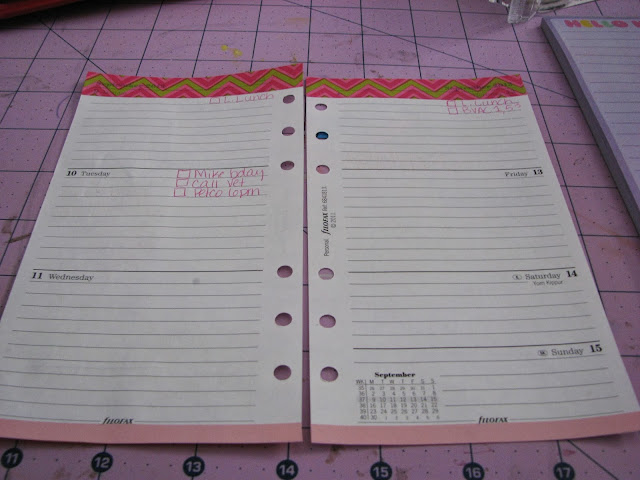 These are my decorated pages for this week. All nice and clean and ready for the week ahead. I list appointments and things to do on the right with a small box to the left, so that I can check or X it off after I've finished the item.